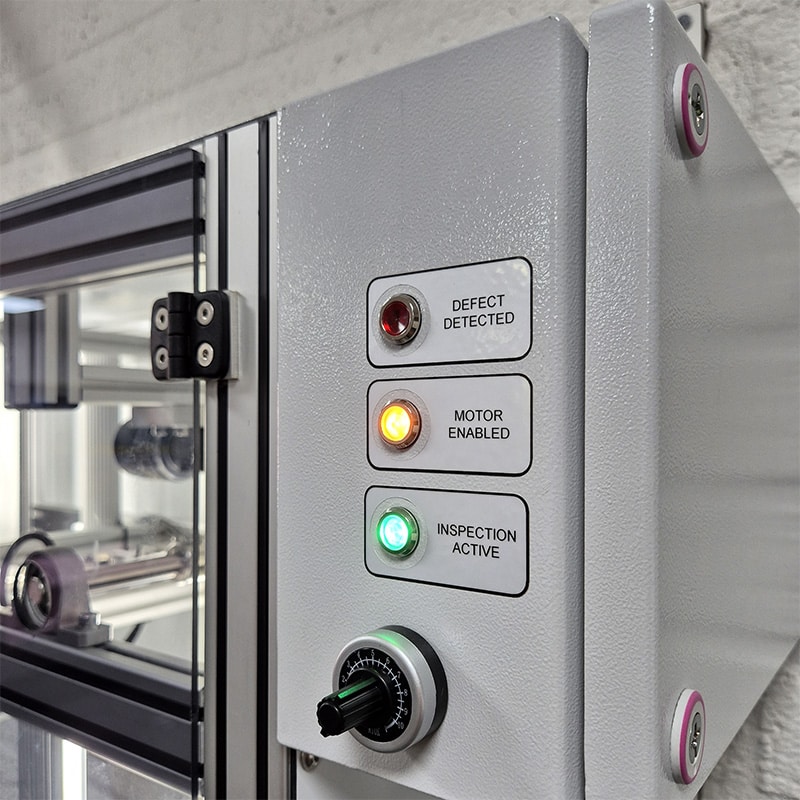 The VIU™ Loom Box is a highly compact yet powerful inspection device for automatic defect detection of loom state rigid narrow fabrics, such as seatbelt webbing, directly on a loom. The system is designed to be compact without compromising inspection performance.